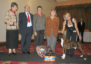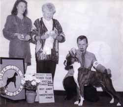 ![]() Ch Winuwuk Lust in the Dust is awarded the prestigious Sire of Merit trophy at the British Boxer Club Championship show for the third year running. Joy Malcolm of the Skelder Boxers is making the presentation. |