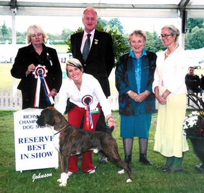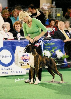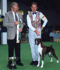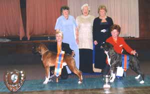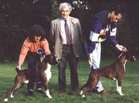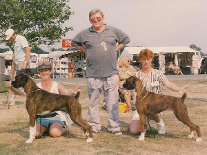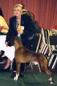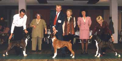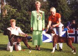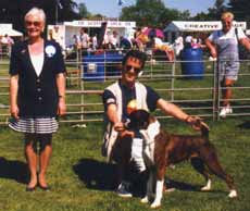 ![]() Ch Winuwuk Love Struck (right) wins the Reserve CC under Yvonne Miller at the British Boxer Club's 2000 Championship Show |