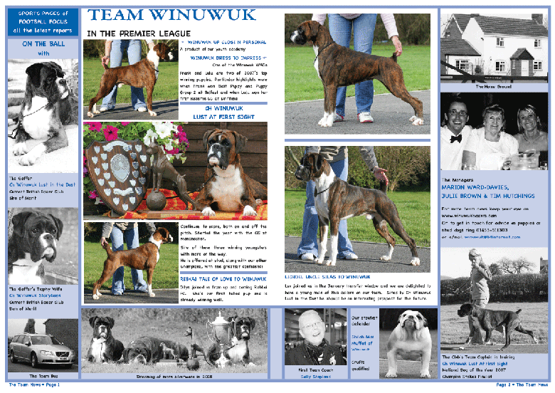 ![]() ![]() At the British Boxer Club Championship Show 2012 we were proud, once again to collect the Champion of Champions trophy on behalf of Ch/Ir Ch Winuwuk Lust at First Sight and also the Dam of Merit trophy on behalf of Ch Winuwuk Storybook. Club President Ferelith Somerfield is making the presentations |
