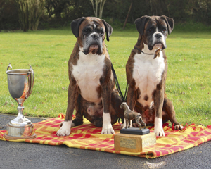 When Ch. Winuwuk Lust at First Sight and his mother Ch. Winuwuk Storybook did the double at Birmingham National under Yvonne Miller it was the 149th and 150th Boxer CC's for Winuwuk. This photo marks the occasion. |