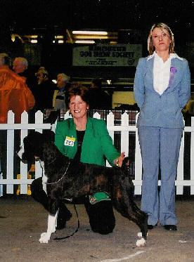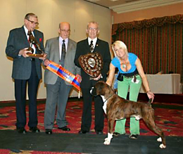 ![]() Ch Winuwuk Lust in the Dust is awarded the prestigious Sire of Merit trophy at the British Boxer Club Championship show for the third year running. Joy Malcolm of the Skelder Boxers is making the presentation. |