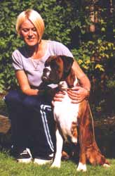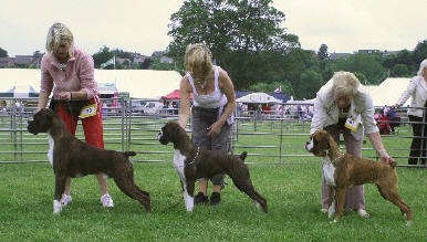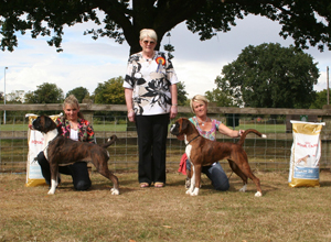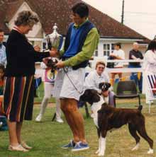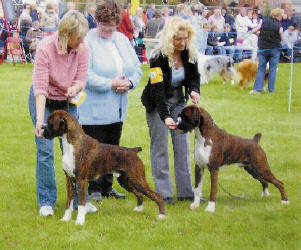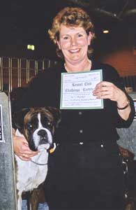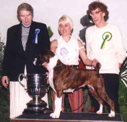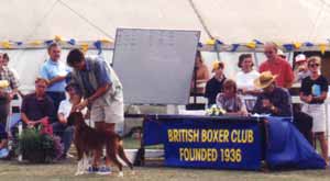 ![]() Ch Winuwuk Love Struck (right) wins the Reserve CC under Yvonne Miller at the British Boxer Club's 2000 Championship Show |