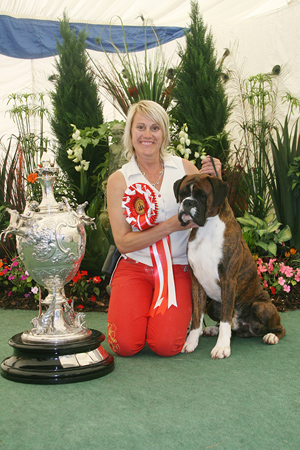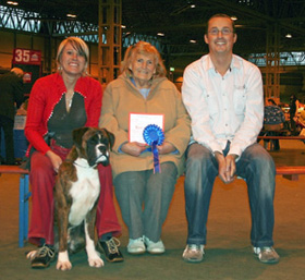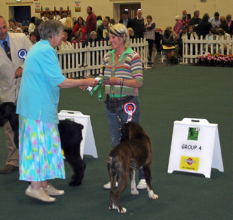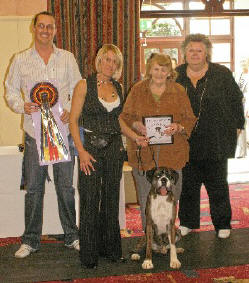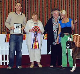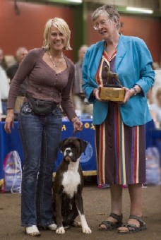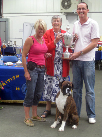 ![]() Collecting Ch/Ir Ch Winuwuk Lust at First Sight's award as Champion of Champions 2010 at the British Boxer Club's Championship show |