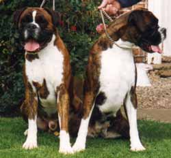 When Ch. Winuwuk Lust at First Sight and his mother Ch. Winuwuk Storybook did the double at Birmingham National under Yvonne Miller it was the 149th and 150th Boxer CC's for Winuwuk. This photo marks the occasion. |