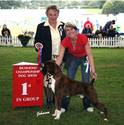 ![]() Ch Rebkai Tale of Love for Winuwuk was a very good winner for us, she won 7 CCs (doing the double with her father twice) and on the day she got made up she won Group 3 at the National under Terry Nethercott. She also went BIS at the Cotswold Boxer Club in 2011 from the biggest breed entry of the year. |