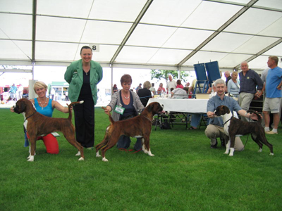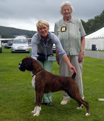 ![]() An historic moment at the Welsh Kennel Club 2010 - on her final appointment giving CCs, the world famous Boxer breeder and judge Pat Heath of the Seefeld kennels, awards the CC & BOB to Ch Winuwuk Lust at First Sight. This was the 200th CC won by a Winuwuk Boxer and was a 46th for Max |